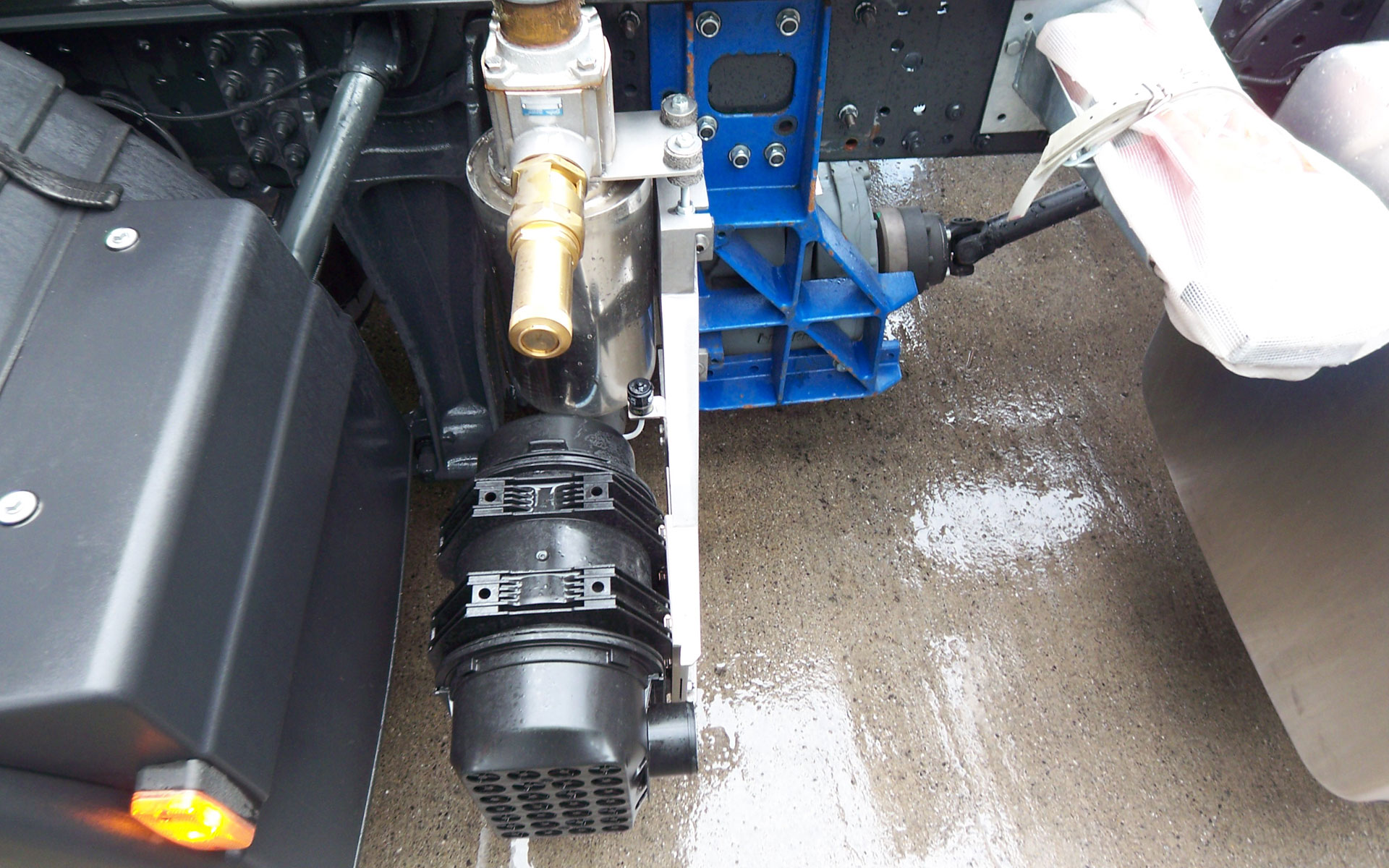 Bei dieser Lösung wird lediglich ein extraschmaler Luftfilter und die Druckleitung außen am Chassis befestigt (Platzbedarf nur 330 mm). Der Kompressor sitzt gut geschützt unter dem Fahrzeug und wird dort direkt über eine Kardanwelle mit Drehmomentbegrenzer vom Nebenantrieb angetrieben.
